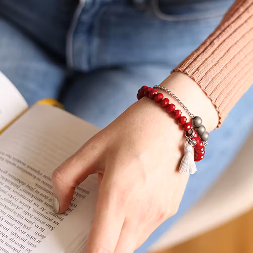 "Amaryllisen A" är ett fint armbandset i grå och djupröd färg. Det här dubbla armbandet är tillverkat av ett pärlarmband med djupröda glaspärlor i rondell form och ett armband med tre pärlor av hematit sten. Välj modellen för din dagens stil. Stjärntecken* i åtanke? Röd färg kan passa utmärkt till: