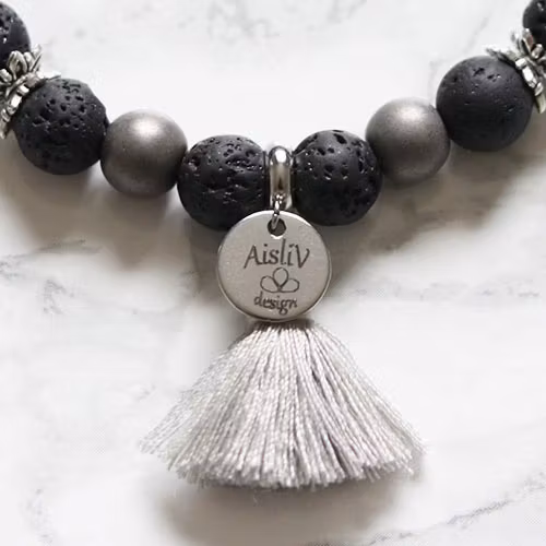 "Ugglan P" är ett svart armband som kan passa till olika outfits. Detta armsmycke i mörka färger är tillverkat för hand av lava och hematit stenar samt en liten grå tofs. Modellens färger - grå och svart - påminner den fina nattfågeln. Är du nyfiken på stjärntecken*? Kombination av svart och grå färger kan vara ett utmärkt val för:
